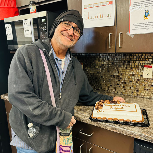 Miguel was one of the first members of our team to join us in our new building and has been growing with us ever since. He has been powder coating on our batch line for his entire 25 years of service! He uses knowledge gained with his tenure to help us ensure we continue to deliver a high quality coated part to our customers. Miguel is always so positive and you can find him with a smile on his face wherever he goes. He was presented with a 25 year pin and chocolate cake to share with his family. It’s been an honor to have Miguel with us for so long and we thank him for trusting us with his journey at All-Color.